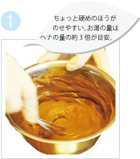 まず最初にボウルに半袋分のヘナを入れます。次に60°Cのお湯を少しずつ加え、ダマにならないよう、マヨネーズ程度の硬さになるまで混ぜあわせていきます。残り半分も同様に、少しずつ混ぜ合わせていきます。