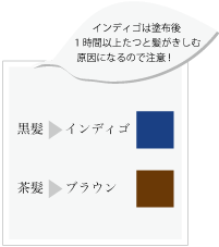 □白髪が気になる方は、必ず最初にオレンジで染めてから、ブラウンあるいはインディゴで2度染めをしてください。